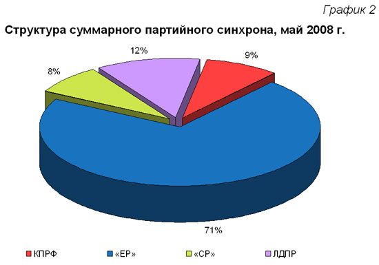 Что касается синхрона (прямой речи) партийцев, то его структура аналогична: единороссам было предоставлено 71% суммарного времени, либерал-демократам – 12%, справороссам – 8%. Коммунистам досталась 31 минута 40 секунд, или 9%, что в 8,2 раз меньше чем представителям «ЕР» и в 1,4 раза меньше, чем ЛДПР (График 2).