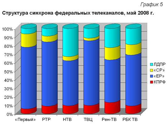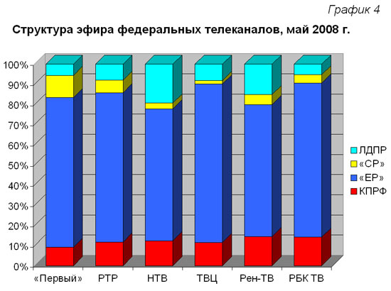 «Единой России» была предоставлена наибольшая доля телеэфира на ТВЦ и «Первом» канале (81 и 75%). Однако нигде эта величина не опускалась ниже 60%. «Справедливая Россия» заняла максимум эфира телеканалов «Россия» и Рен-ТВ (8 и 6%). ЛДПР отдали предпочтение НТВ и Рен-ТВ (22 и 20%).