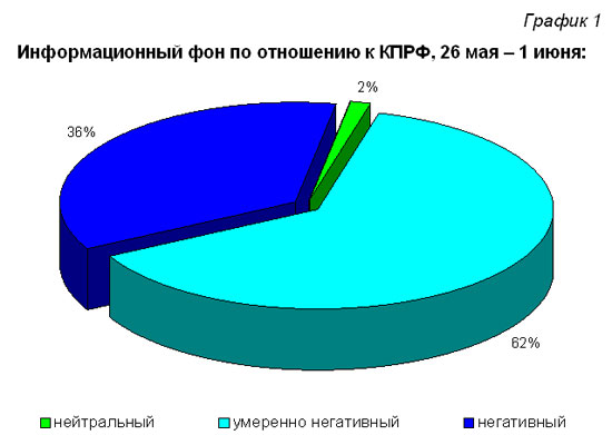 В период с 26 мая по 1 июня 2008 года на шести федеральных телеканалах («Первый», «Россия», НТВ, ТВЦ, Рен-ТВ, РБК ТВ) зафиксировано 6 сообщений о КПРФ. В их число не включены телесюжеты передачи «Парламентский час», анализ которой (с хронометражом) проводится отдельно. Суммарный индекс информационного благоприятствования, рассчитанный по методике ЦИПКР, составил - 18, то есть был резко негативным (Таблица 1).