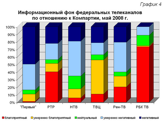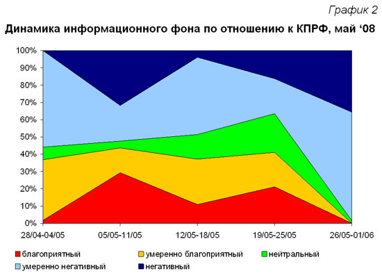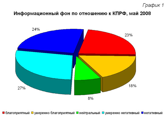 В мае 2008 года наблюдалось примерное равенство благоприятного и негативного характера подачи информации о КПРФ на федеральных телеканалах, с некоторым перекосом в сторону последнего. Доля неблагоприятного характера освещения деятельности партии составляет 51% против 41% позитивного (График 1).