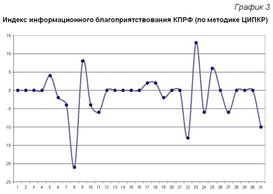 Ежесуточный индекс информационного благоприятствования по отношению к КПРФ, рассчитываемый по методике ЦИПКР, изменялся в течение месяца от –21 до +13 (График 3).