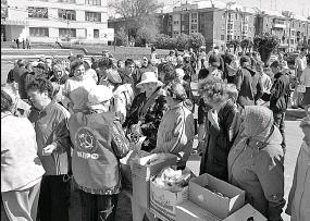 Гостям праздника на площади перед ДК имени 1 Мая — а это были малоимущие пенсионеры, многодетные мамы — бесплатно раздавали соленья, дары "шести соток". По символическим ценам продавались продукты питания.