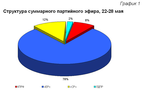 «Единая Россия» получила 50 минут 23 секунды суммарного эфирного времени, что составило 78%. На долю «Справедливой России» пришлось 12% эфирного времени. Коммунистической партии досталось 8% эфира или 4 минуты 48 секунд, что в 10 раз меньше, чем «ЕР», и в 1,5 раза меньше, чем «СР» (График 1).