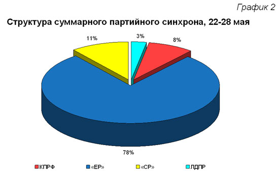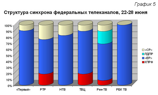Единороссы заняли монопольное положение в эфире РБК ТВ. Также высока была доля их прямой речи на «Первом» канале (90%). Нигде она не опускалась ниже половины суммарного синхрона. Предпочтение справороссам было отдано на каналах «Россия» и НТВ (24 и 17%).