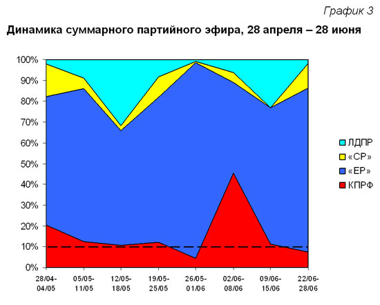 С мая по июнь структура партийного телеэфира менялась следующим образом (График 3):