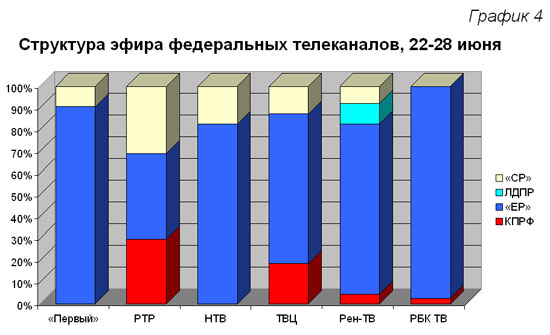 Максимальную долю эфирного времени получила КПРФ на РТР и ТВЦ (30 и 18%). «Первый» канал и НТВ Компартию проигнорировали (График 4).
