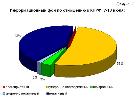В период с 7 по 13 июля 2008 года на шести федеральных телеканалах («Первый», «Россия», НТВ, ТВЦ, Рен-ТВ, РБК ТВ) зафиксировано 9 сообщений о КПРФ. Причём пять из них были полностью посвящены Компартии. Суммарный индекс информационного благоприятствования, рассчитанный по методике ЦИПКР, составил 5, то есть был положительным (Таблица 1).