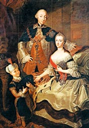 Семейный портрет царственной четы Петр III и будущая Екатерина II, сделанный вскоре после вступления на трон Петра III. Рядом с родителями - юный наследник Павел в восточном костюме. Император после свержения был убит якобы вилкой в висок на пьяной вечеринке с любовником Екатерины |