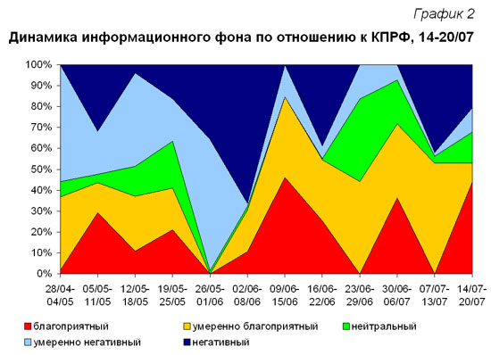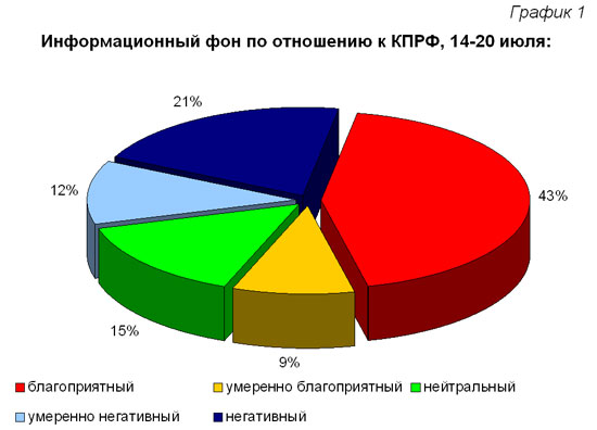 В период с 14 по 20 июля 2008 года на шести федеральных телеканалах («Первый», «Россия», НТВ, ТВЦ, Рен-ТВ, РБК ТВ) зафиксировано 23 сообщения с упоминанием о КПРФ. Суммарный индекс информационного благоприятствования, рассчитанный по методике ЦИПКР, составил -14, то есть был заметно отрицательным (Таблица 1).