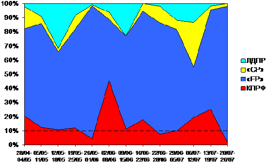 В течение мая-июля структура партийного телеэфира менялась следующим образом (График 3):