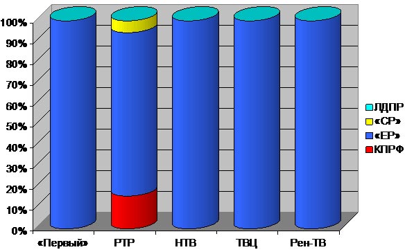 «Единая Россия» монополизировала телеэфир на «Первом» канале, НТВ и Рен-ТВ. Однако нигде эта величина не опускалась ниже пяти шестых.