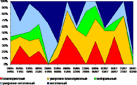 В целом прослеживается понедельная динамика положительных и негативных преобладающих тенденций: период с высокой долей позитивной информации сменяется равным по продолжительности периодом с преобладанием неблагоприятного фона и наоборот. По сравнению с июнем, второй летний месяц отмечен большими контрастами информационного фона в недельном разрезе.
