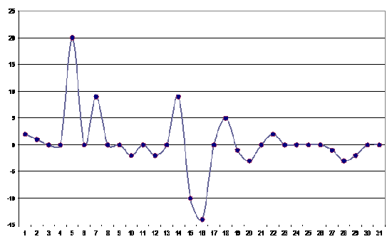 Июль характеризуется ещё меньшей хаотичностью динамики индекса информационного благоприятствования, чем июнь, и тем более – чем май. Наблюдается всего один существенный «всплеск» (5 и 7 числа) и один «провал» (15-16.07).