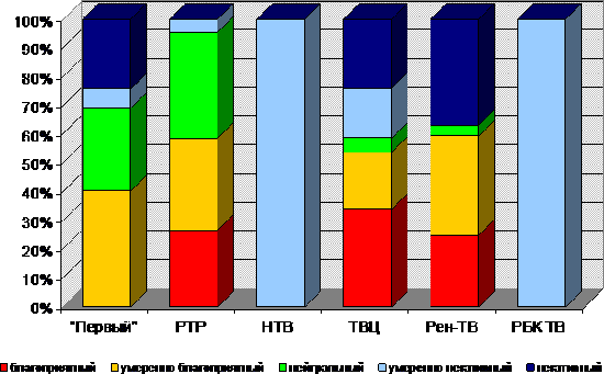 На остальных четырёх федеральных каналах сложилась следующая обстановка. Наиболее контрастен оказался Рен-ТВ – его эфир содержал как максимальную долю резко негативной информации, так и значительную часть благоприятной. В целом наименее лояльным к Компартии можно назвать «Первый» канал – на нём не вышло ни одной секунды полностью позитивных материалов о КПРФ и достаточно велика была доля нейтральных материалов. Телеканал «Россия» в июле показал себя с лучшей стороны: в его эфире отсутствовала резко негативная информация. Доля умеренно негативной также была сведена к минимуму.