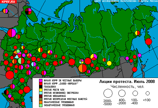 Июль 2008 года был богат на протестные мероприятия. Народ, обманутый в ходе последних парламентских и президентских выборов, стал постепенно осознавать, что вновь стал жертвой стремления слуг капитала придти к власти и ещё туже набить карманы. Это стало поводом для новой волны народного недовольства. Как обычно серьёзную поддержку гражданам в организации акций протеста оказала КПРФ. Под её флагами было проведено две Всероссийские акции протеста: «За честные и чистые выборы» и «Слово народу». сего же за месяц было зарегистрировано 103 акции протеста с общим количеством участников около 22 000 человек.