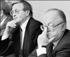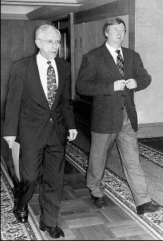 24 сентября. Вицепремьер Александр Шохин и председатель Центробанка Виктор Геращенко после первого заседания нового кабинета. Фото REUTERS |