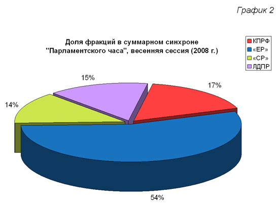 Доля эфира, отводимая фракции КПРФ в передаче «Парламентский час» за период весенней сессии колебалась в пределах от 1,4% (18 мая) до 32% (10 февраля, «Дискуссионной клуб» в программе с участием от Компартии Д.Новикова и общественные слушания во фракции КПРФ по вопросу образования). А доля синхрона – от 3,4% (25 мая), до 35% (27 января, развёрнутое интервью с Ниной Останиной о социальной политике государства). В целом наименьшие значения этого показателя для Компартии приходятся на апрель-май, а наибольшие – на февраль-март.