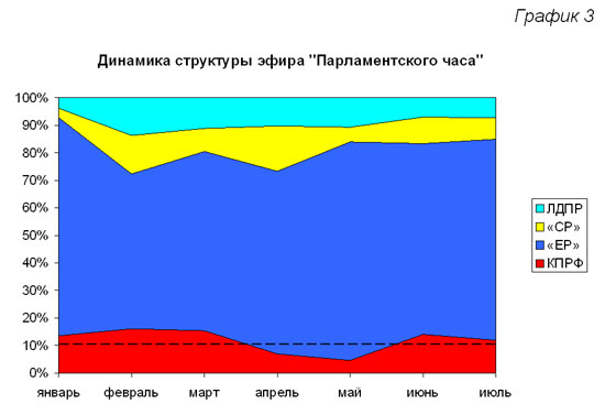 Доля эфира, предоставленного передачей «Парламентский час» каждой из фракций, менялась в течение весенней сессии следующим образом (График 3):