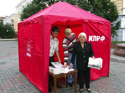 Красноярские коммунисты возобновили добрую традицию, которая родилась прошлой осенью в ходе кампании по выборам депутатов Государственной думы. На улицах краевого центра разбиты красные палатки.