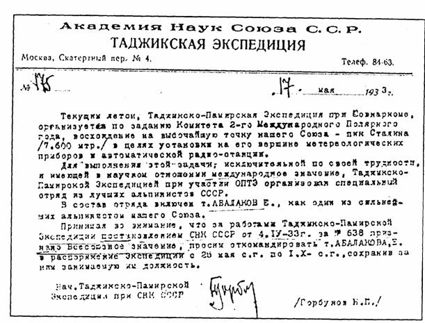 Весьма красноречива в этой связи сохранившаяся в архивах семьи расчетная платежная ведомость с альпинистом 29 отряда Таджикско-Памирской экспедиции Академии Наук и Совнаркома СССР Е.М. Абалаковым от 29 октября 1933 года.