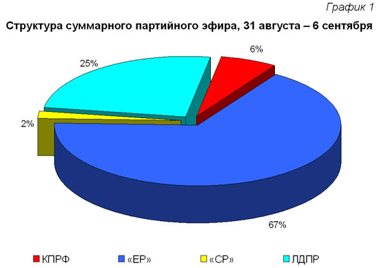 За период с 31 августа по 6 сентября на шести федеральных телеканалах четырём парламентским партиям было посвящено 32 минуты 2 секунды новостного партийного эфира (Таблица 1).