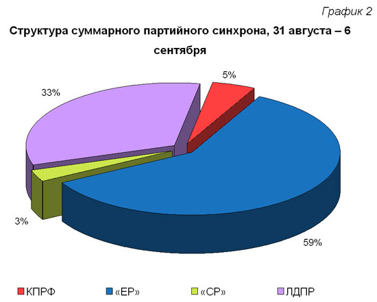Что касается синхрона (прямой речи) партийцев, то его структура аналогична: единороссам было предоставлено 59% суммарного времени, либерал-демократам – 33%, справороссам – 3%. Коммунистам досталось 55 секунд, или 5%, что в 13 раз меньше, чем представителям «ЕР» и в семь раз меньше, чем ЛДПР (График 2).