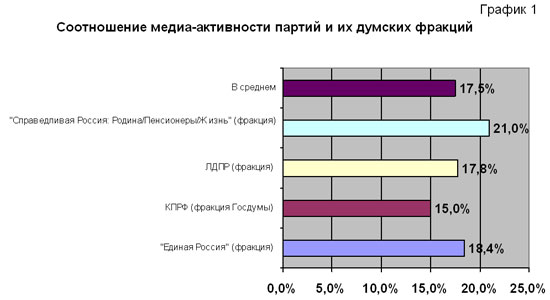 Интерес представляет соотношение медиа-активности партий и их думских фракций (гр.1).