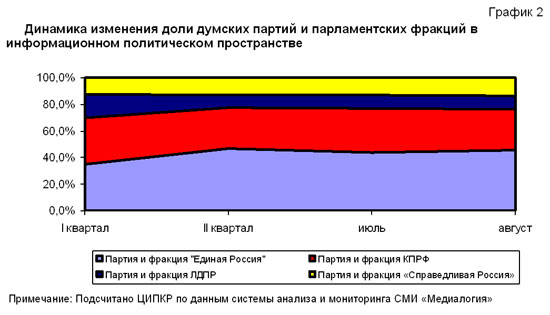 При освещении деятельности думских фракций парламентских партий преимущество «Единой России» отмечалось весь анализируемый период (даже в период президентских выборов). Доля «ЕР» в думском медиа-пространстве колебалась в январе-августе от 40 до 48%. А КПРФ – от 25-30%. .