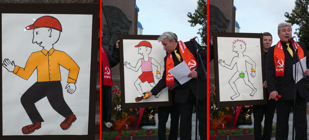 Кульминацией митинга стала импровизация того, как власть обдирает среднестатистического человека налогами, растущими ценами и тарифами, квартплатой, «школьными» поборами и т.н. «бесплатным» медобслуживанием. В результате этих «взиманий» нарисованный на картоне человечек шаг за шагом лишался деталей одежды. В результате, человечек остался в фиговом листочке, который, как выразился озвучивавший действие секретарь Тамбовского ОК КПРФ А.Жидков, пригодится «гражданину» для самого священного действа: дабы руки были свободны, чтоб отдать свой голос за оголившую его партию «Единую России». Смех смехом, а картинка воспроизвела то, что происходит в реальной жизни. И многие вопросы, возникшие в головах людей, не находят ответов у власти. Более того, нас пытаются убедить, что так и должно быть, что все делается для нашего блага, что мы не заслуживаем лучшего и просто не понимаем своего счастья.
