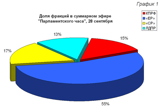 28 сентября 2008 года в передаче «Парламентский час» на телеканале «Россия» фракции КПРФ было посвящено 5 минут 13 секунд или 15%. Фракция «Единая Россия» заняла 55% эфира передачи, или 19 мин 14 сек, что в три с половиной раза больше, чем КПРФ. «Справедливая Россия» получила 17% эфира, что на 49 секунд больше, чем Компартия.