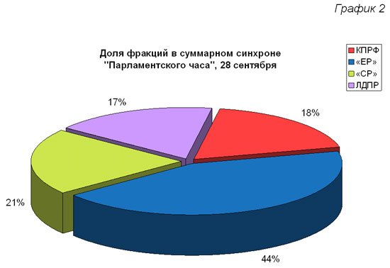 28 сентября в «Парламентском часе» вышло всего 8 телесюжетов (Таблица 1). Из них пять было посвящено только депутатам фракции «Единая Россия».