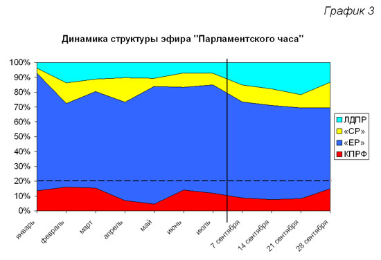 Доля эфира, предоставленного передачей «Парламентский час» каждой из фракций, менялась с начала работы V созыва следующим образом (График 3):