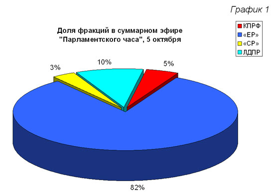 5 октября 2008 года в передаче «Парламентский час» на телеканале «Россия» фракции КПРФ была посвящен 1 минута 42 секунды или 5%. Фракция «Единая Россия» заняла 82% эфира передачи, или 28 мин 52 сек, что в 18 раз больше, чем КПРФ. Фракция ЛДПР получила 10% эфира, что в два раза больше, чем Компартия.