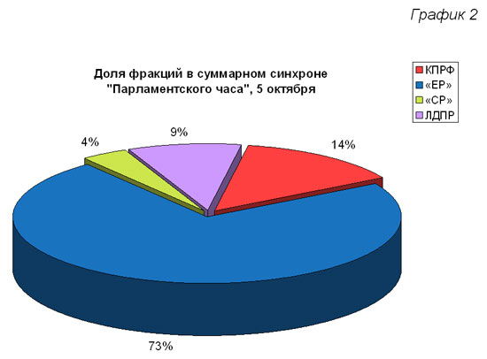 5 октября в «Парламентском часе» вышло всего 11 телесюжетов (Таблица 1). Из них семь было посвящено только депутатам фракции «Единая Россия».