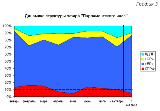 Доля эфира, предоставленного передачей «Парламентский час» каждой из фракций, менялась с начала работы V созыва следующим образом (График 3):