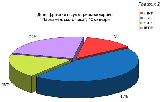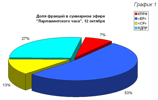 12 октября 2008 года в передаче «Парламентский час» на телеканале «Россия» фракции КПРФ было посвящено 1 минута 48 секунд, или 7%. Фракция «Единая Россия» заняла 53% эфира передачи, или 12 мин 39 сек, что в семь раз больше, чем КПРФ. Фракция ЛДПР получила 27% эфира, что в четыре раза больше, чем Компартия, а «СР» 13%, что больше в полтора раза.