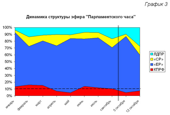 Доля эфира, предоставленного передачей «Парламентский час» каждой из фракций, менялась с начала работы V созыва следующим образом (График 3):