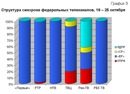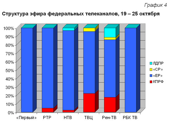 «Единая Россия» монополизировала телеэфир «Первого» телеканала и РБК ТВ. Ни на одном канале эта величина не опускалась ниже двух третей. «Справедливая Россия» заняла максимум эфира на телеканалах ТВЦ и Рен-ТВ (4 и 3%). ЛДПР отдал предпочтение Рен-ТВ (11%).