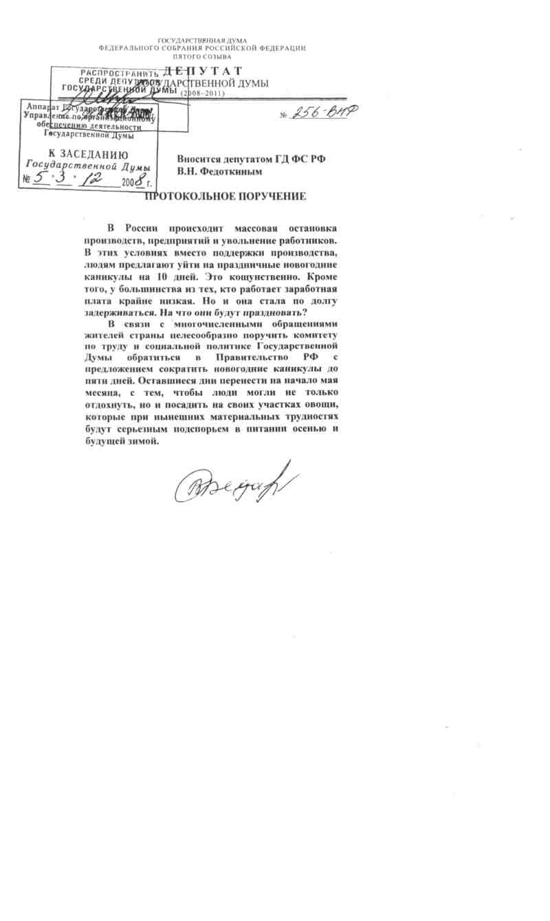 В связи с многочисленными обращениями жителей страны целесообразно поручить комитету но труду и социальной политике Государственной Думы обратиться в Правительство РФ с предложением сократить новогодние каникулы до пяти дней. Оставшиеся дни перенести на начало мая месяца с тем, чтобы люди могли не только отдохнуть, но и посадить на своих участках овощи, которые при нынешних материальных трудностях будут серьезным подспорьем в питании осенью и будущей зимой.