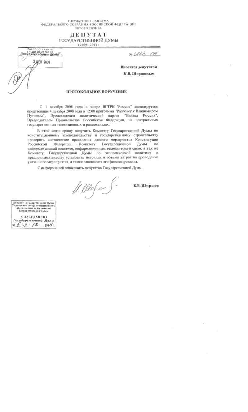 В этой связи прошу поручить Комитету Государственной Думы по конституционному законодательству и государственному строительству проверить соответствие проведения данного мероприятия Конституции Российской Федерации. Комитету Государственной Думы по информационной политике, информационным технологиям и связи, а так же Комитету Государственной Думы по экономической политике и предпринимательству установить источник и объемы затрат на проведение указанного мероприятия, а также законность его финансирования.