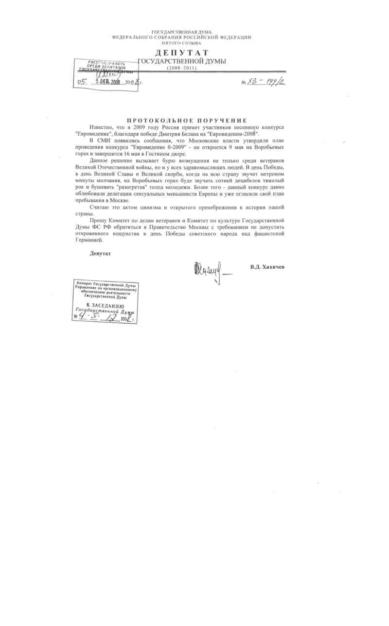 На пленарном заседании Госдумы 5 декабря депутат-коммунист Владимир Хахичев поставил вопрос о недопустимости открытия в Москве конкурса "Евровидение-2009" в День Победы.