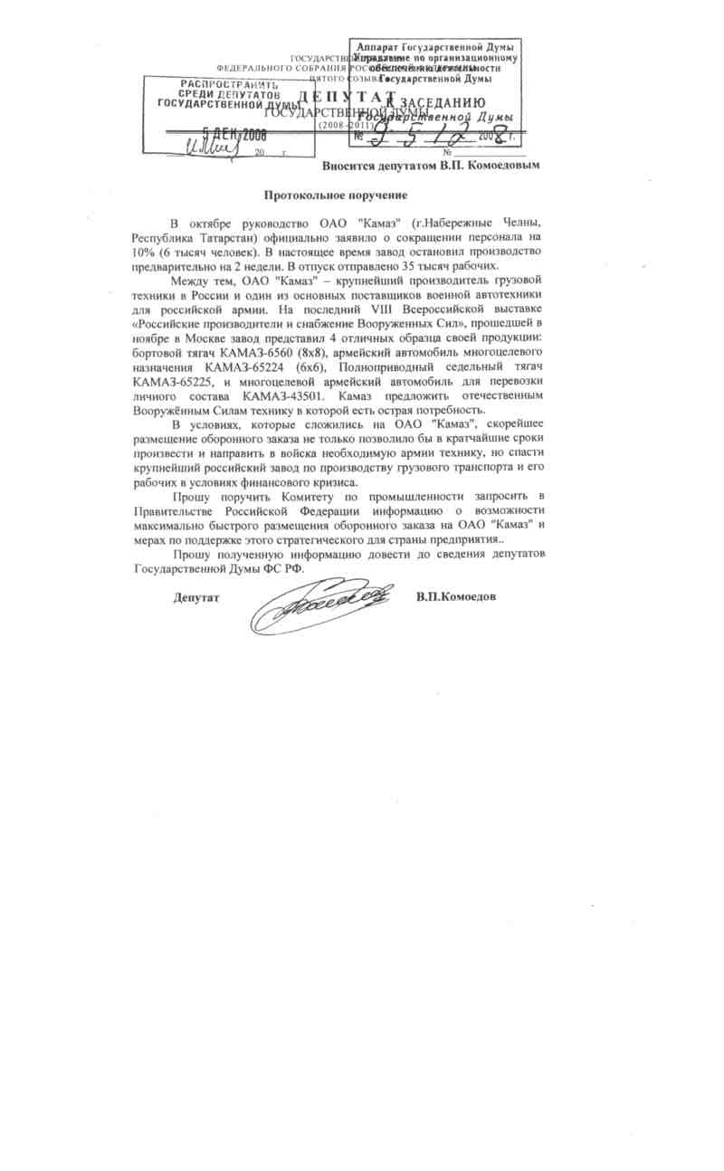 Прошу поручить Комитету по промышленности запросить в Правительстве Российской Федерации информацию о возможности максимально быстрого размещения оборонного заказа на ОАО "Камаз" и мерах по поддержке этого стратегического для страны предприятия..