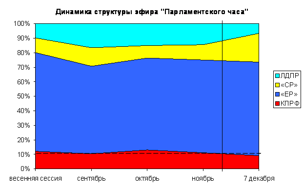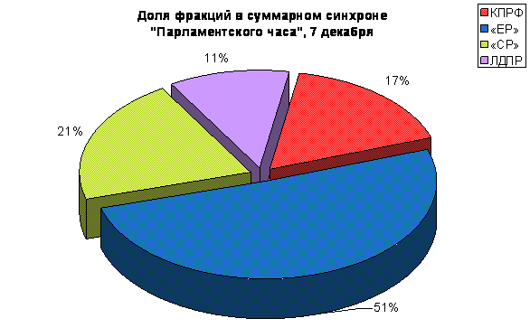 Из графика видно, что первая декабрьская передача «Парламентского часа» отличается понизившейся долей КПРФ (этот показатель упал ниже 10%-ной отметки). Также необходимо отметить значительное увеличение части эфира, отводимого «Справедливой России», при эквивалентном снижении доли ЛДПР.