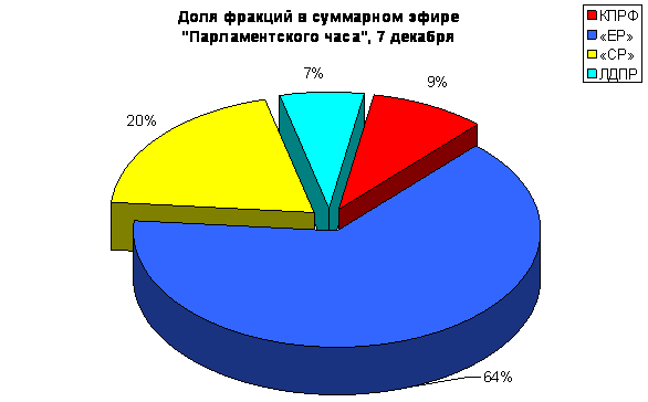 7 декабря 2008 года в передаче «Парламентский час» на телеканале «Россия» фракции КПРФ было посвящено 2 минуты 23 секунды или 9%. Фракция «Единая Россия» заняла 64% эфира передачи, или 16 мин 56 сек, что в семь раз больше, чем КПРФ. Фракция «СР» получила 20% эфира, что в два раза больше, чем Компартия.