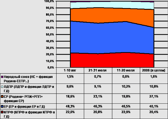 Как видно, в сравнении с 2006 годом произошло довольно значительное перераспределение информационных потоков от второй партии власти («Справедливой России») к первой («Единой России»). Если в 2006 году «ЕР» цитировалась и упоминалась в 40,1% публикаций всех СМИ (ТВ. радио, газеты, Интернет, как центрального так и регионального уровней), то в первой декаде августа 2007 года этот показатель составил 48,3. Доля партий, образовавших «Справедливую Россию», в партийно-политическом информационном пространстве России упала с 27,1% в 2006 году до 18,6 в первую декаду августа.