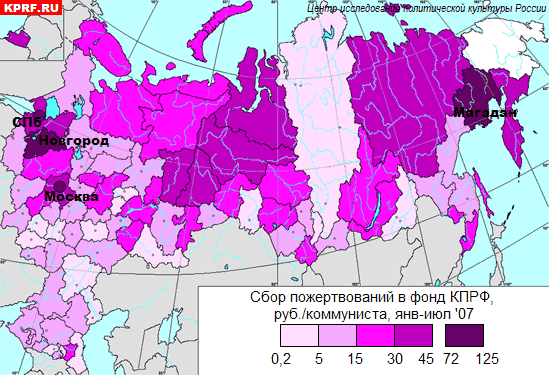 Четыре региональных отделения Компартии РФ резко выделяются по объёму пожертвований на одного коммуниста (Рис. 1). Это Московское городское, Магаданское областное, Санкт-Петербургское городское и Новгородское областное партотделения, собравшие более 70 руб./комм. Разрыв между ними и следующей группой региональных отделений составляет 1,6 раза. В девяти регионах было собрано от 30 до 45 рублей пожертвований на коммуниста. Это Камчатский, Свердловский, Пермский обкомы, Ямало-Ненецкий и Ханты-Мансийский окружкомы, Московский и Калининградский обкомы, Якутский реском и Ленинградский обком. Среди отстающих следует назвать, Хакасское, Дагестанское, Чувашское и Марийское региональные отделения, собравшие в фонд помощи КПРФ менее рубля.