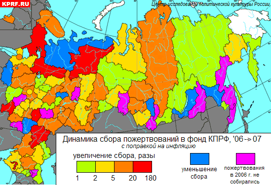 KPRF.RU уже публиковал данные Отдела организационно-партийной и кадровой работы ЦК КПРФ, свидетельствующие о трехкратном росте сбора пожертвований в Фонд КПРФ. Эксперты Центра исследований политической культуры России для удобства и наглядности подготовили специальные карты для анализа региональных различий в динамики сбора пожертвований по регионам. Как отмечал неоднократно Г.А.Зюганов, один из критериев боевитости и эффективности деятельности региональных отделений – это показатели сбора пожертвований в Фонд КПРФ.