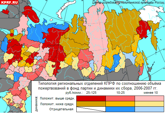 Наконец, только 4 региональных организации, при средних объёмах пожертвований, снизили их собираемость. Это Псковский, Архангельский и Воронежский обкомы, Бурятский реском. Самими отстающими следует признать Марийский реском, Амурский и Кемеровский обкомы – для них характерны не только минимальные объёмы пожертвований в масштабе страны, но и отрицательная динамика.