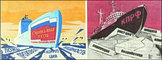 В качестве иллюстрации СМИ, в частности сайт Dp.ru, сравнивают известный символ КПРФ – ледокол, разбивающий льды, на которых написано: "Рост цен", "Безработица", "Нищета", "Коррупция" и т. д. – с почти таким же недавно появившимся ледоколом "справороссов".