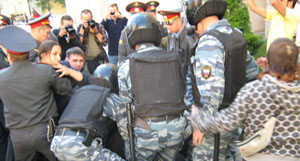 В 16 часов на место событий приехали два автобуса с ОМОНом, омоновцы потребовали от собравшихся разойтись. Люди отказались, так как все ждали результатов переговоров, тогда ОМОН попытался оттеснить их от здания мэрии. Но участники акции протеста сцепились, и оттеснить их не удалось. В результате, ОМОН получил приказ уехать. Тем не менее, одного активиста удалось незаметно задержать. После того, как выяснилось, что в одном из автобусов находится задержанный, жители перекрыли ему выезд и потребовали освобождения. Активиста отпустили спустя несколько минут.
